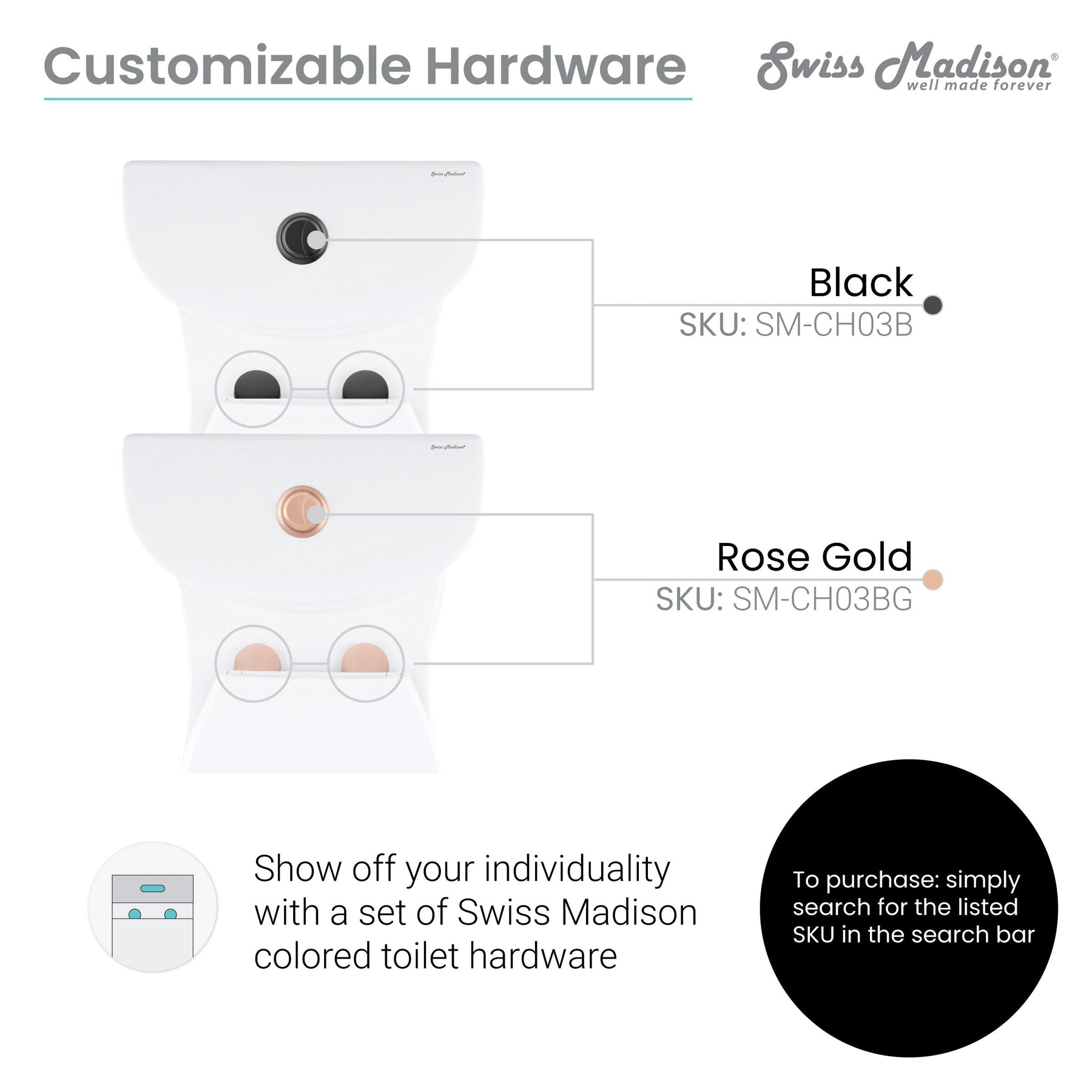 • Includes Tank, Bowl, Seat, Wax Ring, Bolt Kit and Cover Caps