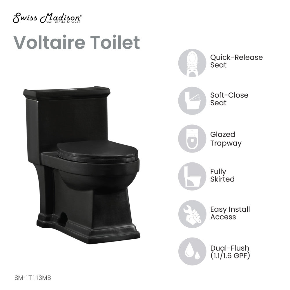 Embrace timeless elegance with the Voltaire collection, fusing classic charm with contemporary comfort. Redefine your bathroom with our one-piece toilet, combining seamless design and functionality for a truly modern upgrade. Offered in black with a matte finish.