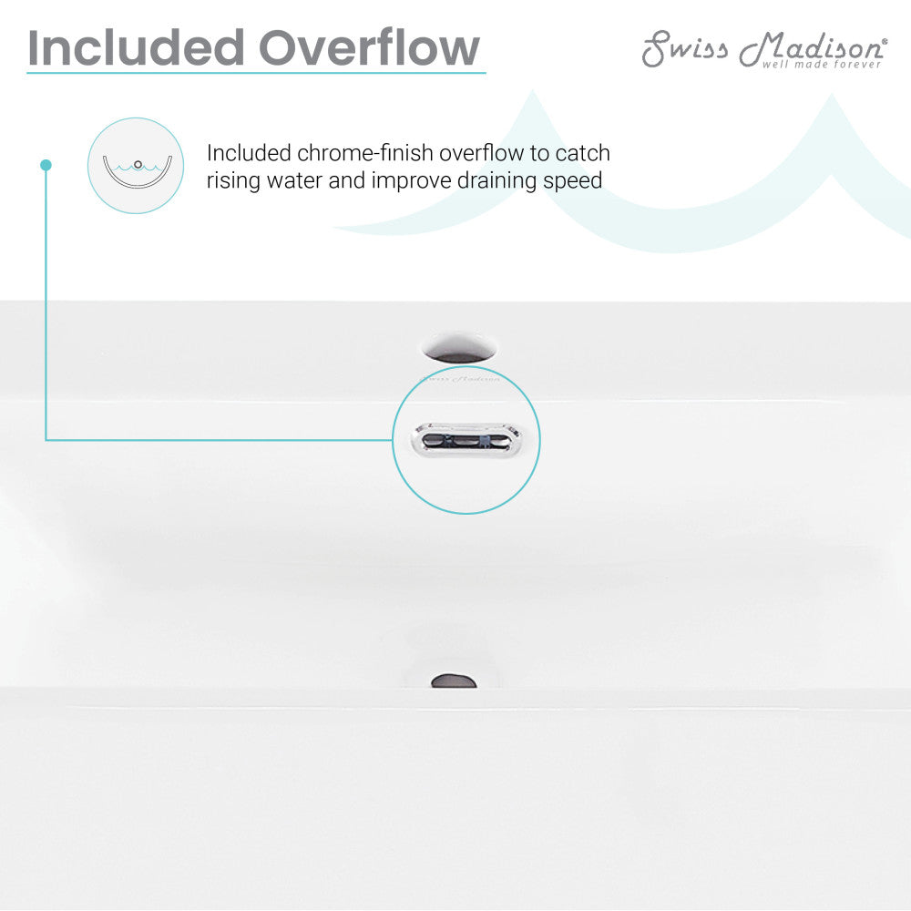 • Overflow: Equipped with an overflow that offers easy installation, spill prevention, and space-saving properties.