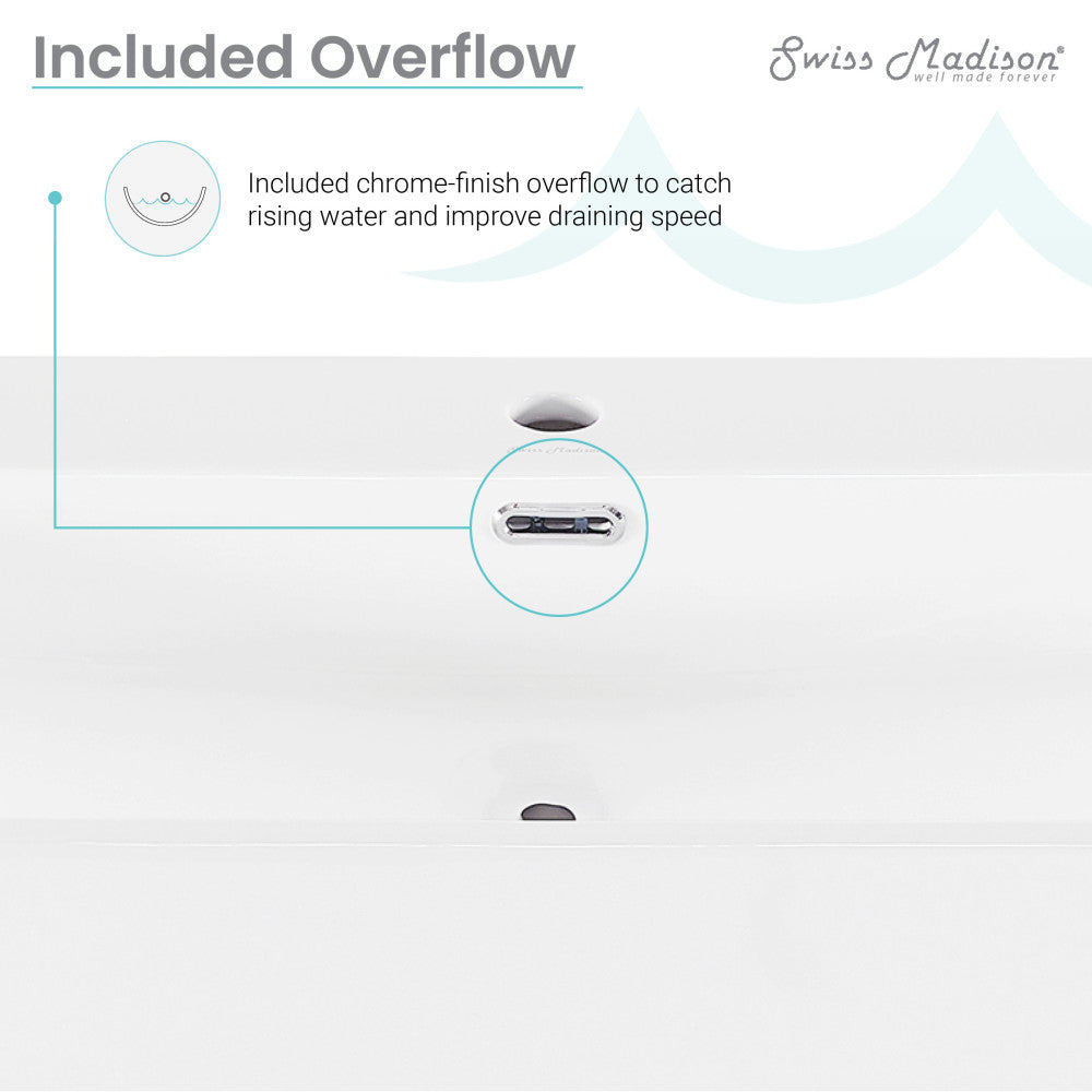 • Overflow: Equipped with an overflow that offers easy installation, spill prevention, and space-saving properties.