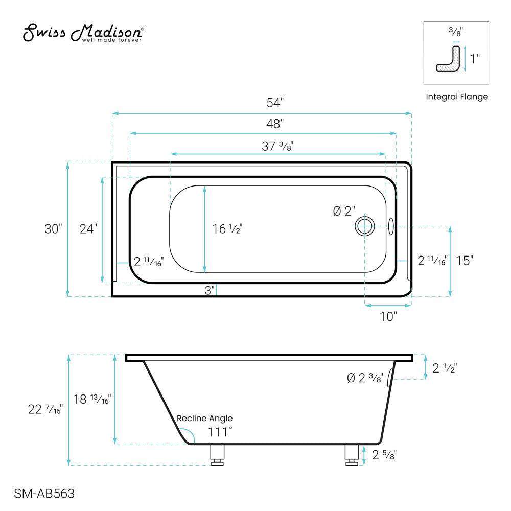 Voltaire 54" x 30" Acrylic Glossy White, Alcove, Integral Right-Hand Drain, Bathtub