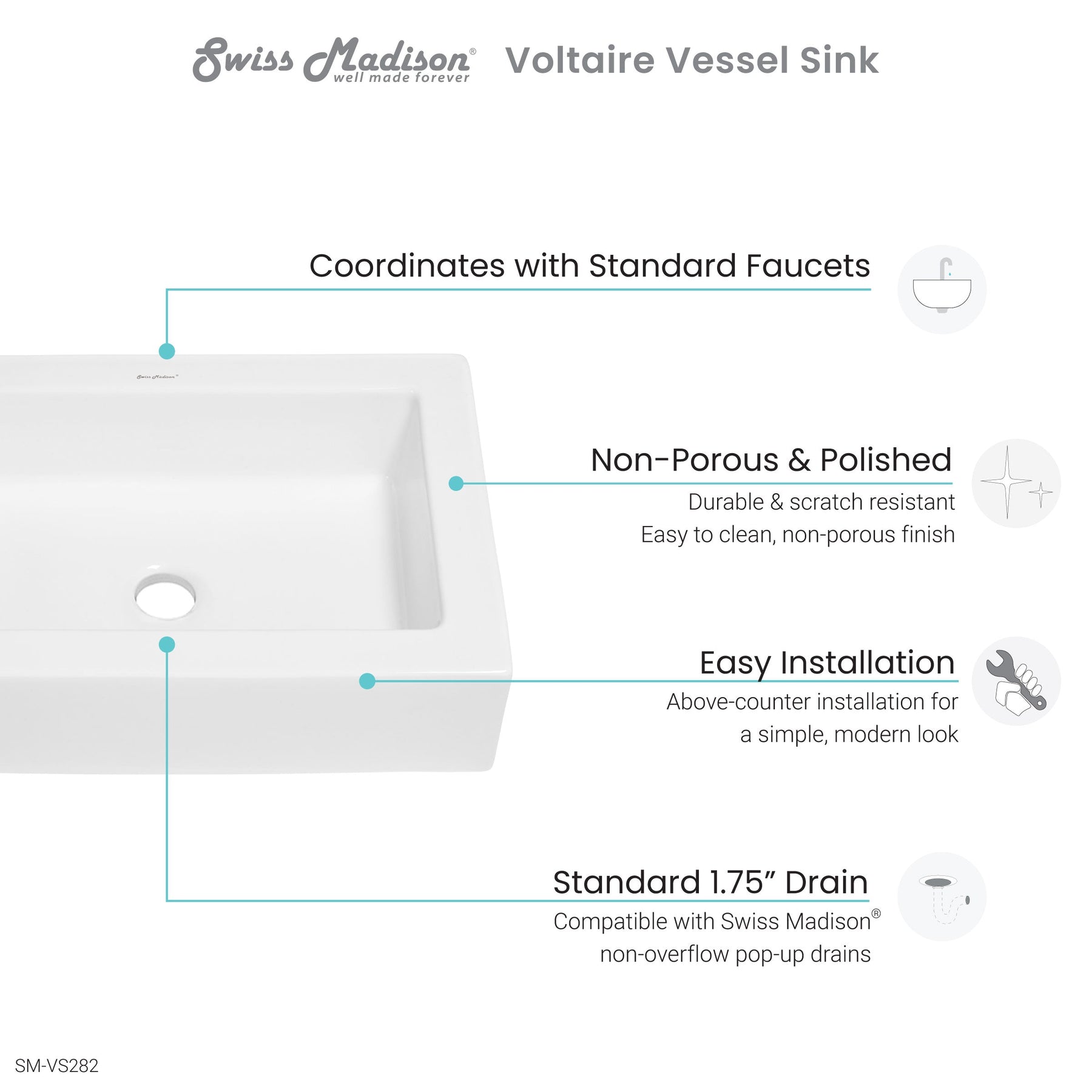- Drain: Standard 1.75" inch drain opening.
