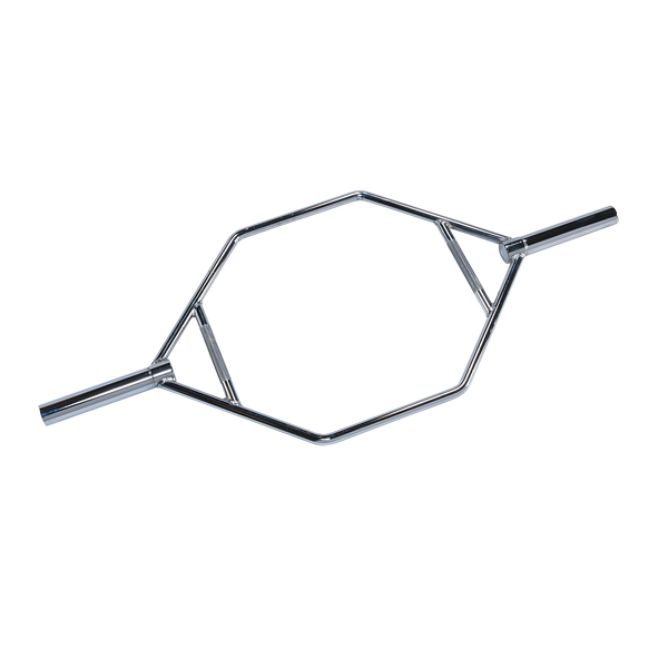 Doing shrugs with this Olympic Trap Bar builds mass and thickness throughout the mid-back and upper traps. Uniquely designed to eliminate contact with the upper thighs and front torso to provide greater range of muscle contraction and deep tissue development. Used for shrugs, dead lift, bench press, military press, squats and lunges. Builds thicker, stronger legs by allowing you to use heavier weights with less strain on the lower back. Solid steel with super-durable zinc plated finish.