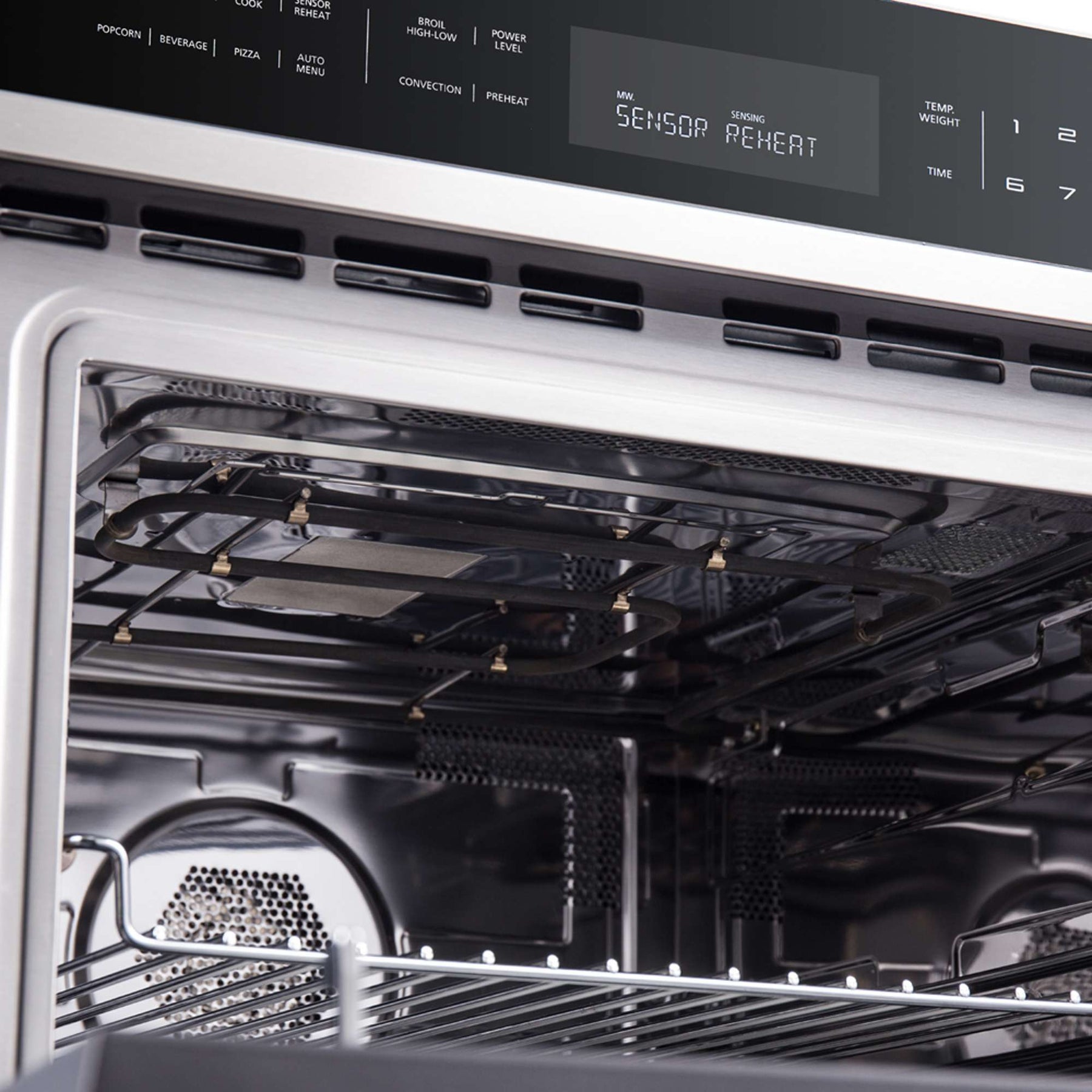 The Forno Oliena 30" Microwave & Convection Oven combines sleek design with versatile functionality, making it an essential addition to any modern kitchen. Its durable stainless-steel interior ensures easy cleaning, while intuitive glass touch controls and an LCD display provide effortless navigation. With 1,000 watts of microwave power, it heats food quickly, boiling water in just 1 minute and 50 seconds. Switch to convection mode for even cooking with 1,700 watts of true convection, or utilize the 1,750-watt broil and 600-watt bake functions for perfectly cooked meals without using your main oven. Sensor cooking, auto menu options, and specialized modes like defrost, popcorn, and beverage heating enhance convenience. The rapid preheat feature minimizes wait times, so your dishes are ready faster. Designed for performance and efficiency, this combination microwave oven elevates your cooking experience with precision and speed.