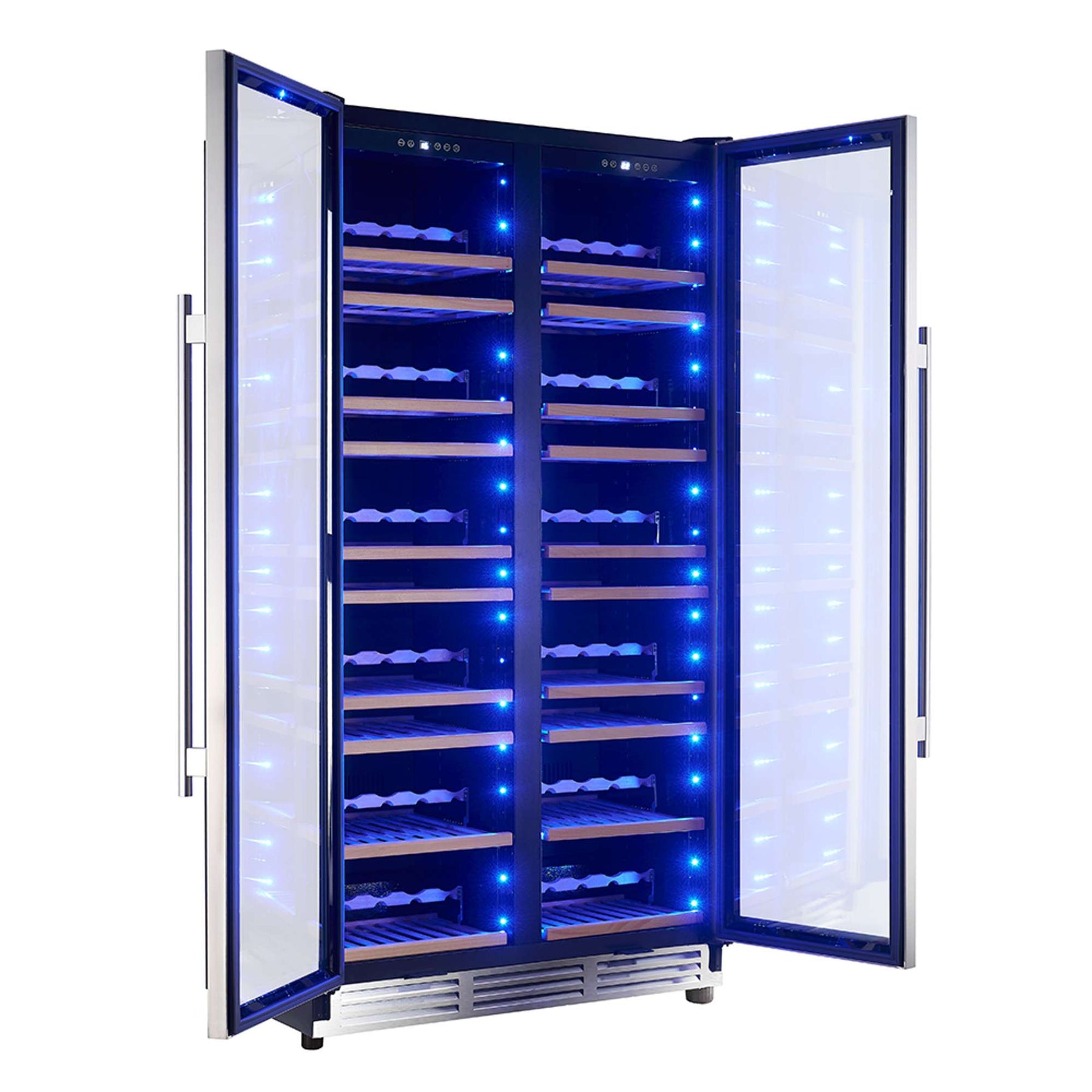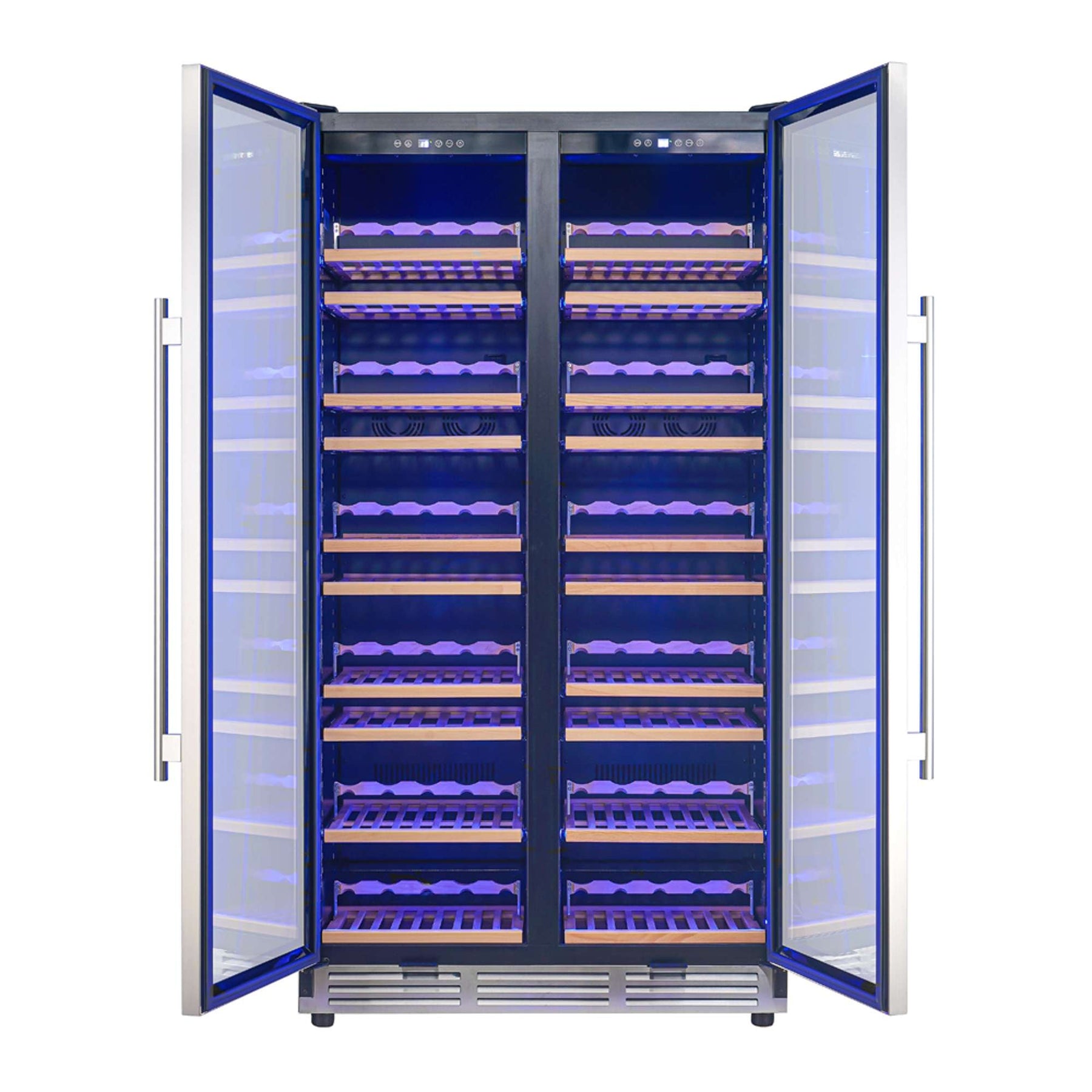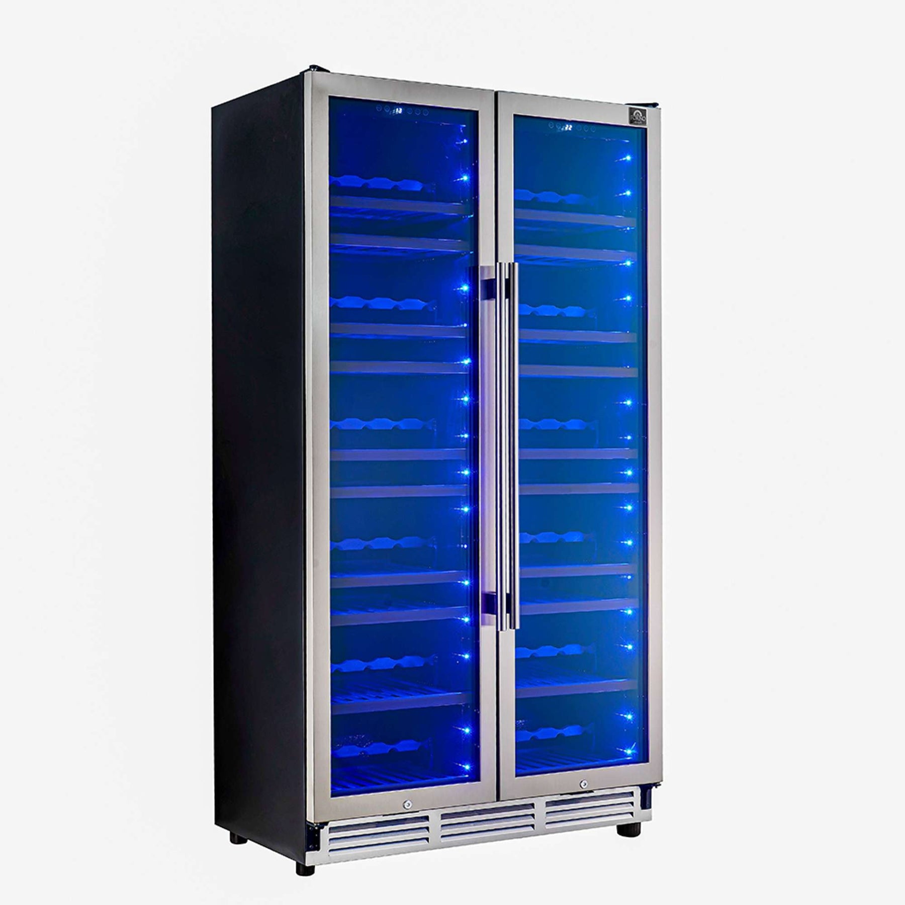 Elevate your wine collection with the Forno Vernazza 40" Dual Zone Wine Cellar, designed for optimal storage and elegance. With dual temperature zones, it preserves both red and white wines at ideal conditions. The stainless steel door frame and triple-layer UV-protected glass shield your collection from light exposure and condensation, maintaining flavor integrity. Inside, adjustable sliding and display shelves offer flexible storage, illuminated by soft LED lighting for a sophisticated presentation. The touchscreen control panel ensures precise temperature adjustments, while the charcoal air filter eliminates unwanted odors. A high-efficiency compressor provides consistent cooling with minimal energy consumption. For added security, the lockable door keeps your collection safe. With a spacious 25.07 cu. ft. capacity, this large wine cellar holds up to 166 bottles, making it perfect for connoisseurs and collectors alike.