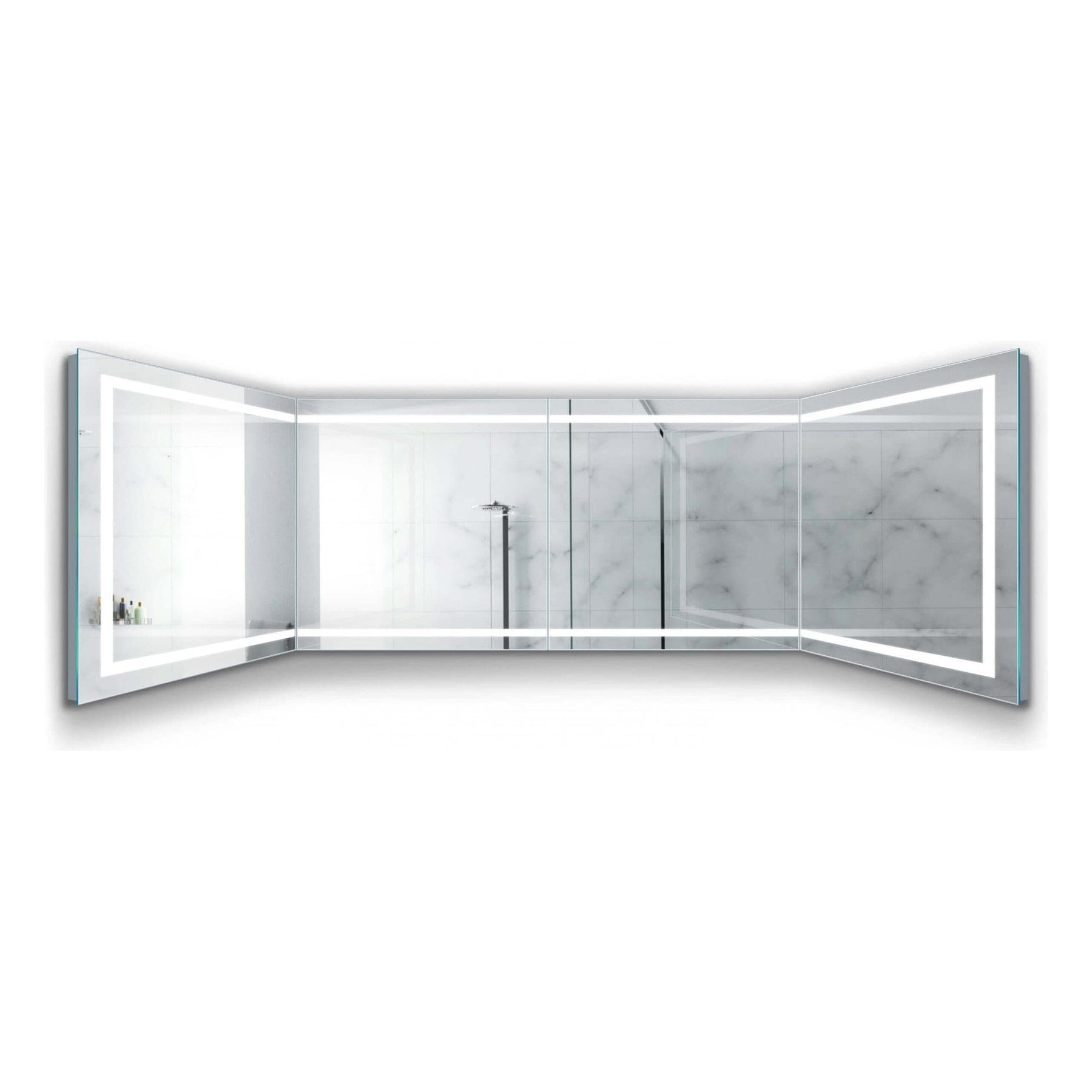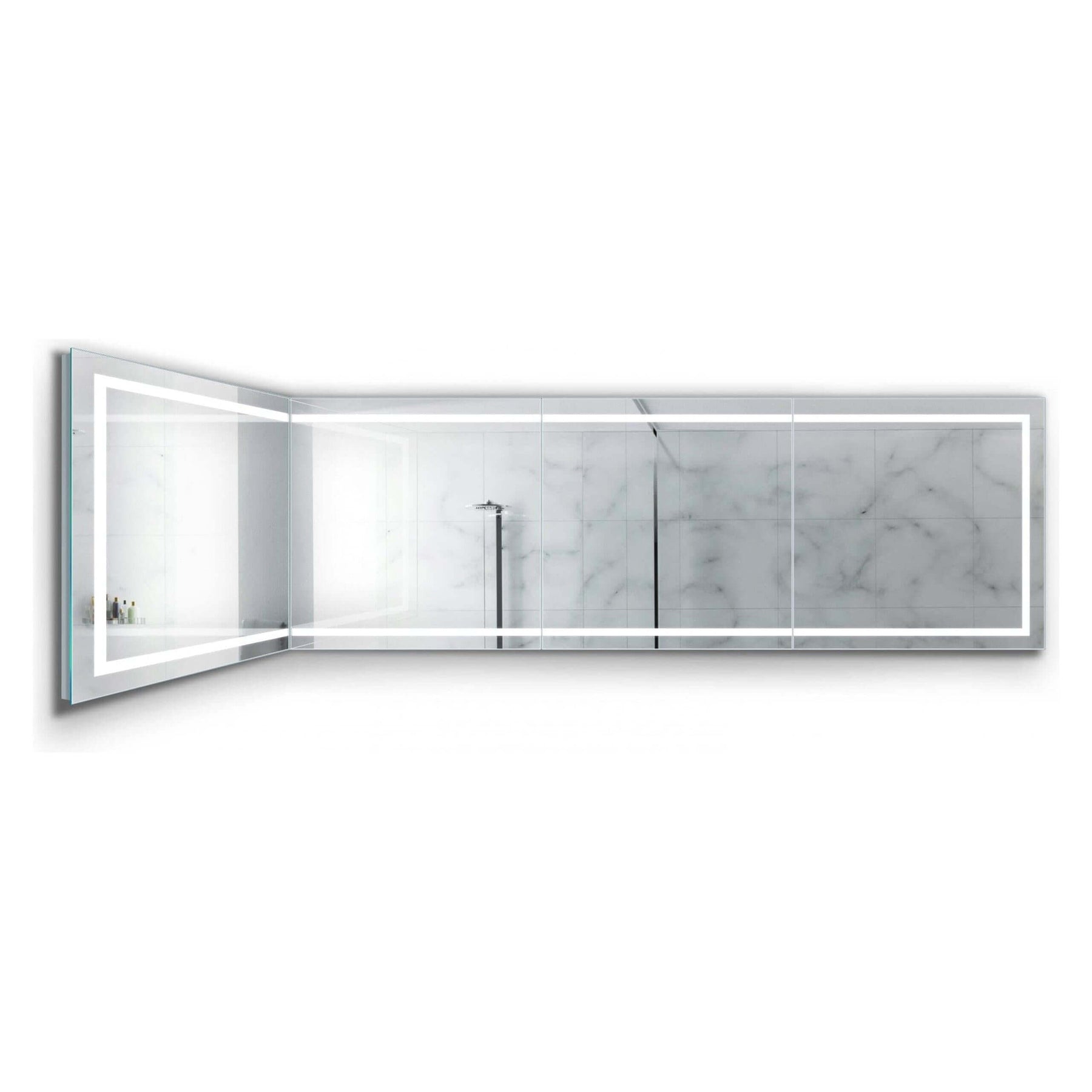 Customize with Confidence: The unparalleled versatility of these modular mirrors allows for unique configurations to perfectly fit your space. Whether as individual statements of elegance or combined—featuring the 36" x 36" left, two 36" x 36" center, and 36" x 36" right mirrors—for a striking visual expanse of 144" x 36" (12 feet by 3 feet), these mirrors bring sophistication and practical clarity to any setting. With energy-saving LED lighting, a built-in defogger, and an intuitive on/off sensor dimmer, elevate your space to new heights of elegance.