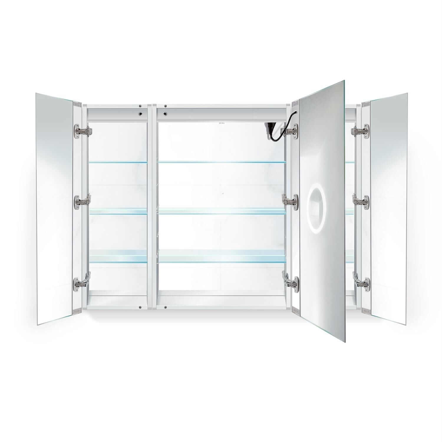 • Optimize your bathroom with the modern Krugg Svange 48 x 36 LED Medicine Cabinet, featuring three doors: Left, Right, and Right Door Opening. This lighted medicine cabinet features three doors: one opens to the left and two to the right.