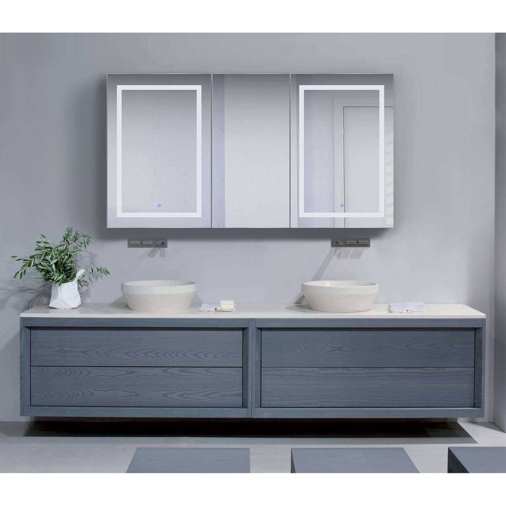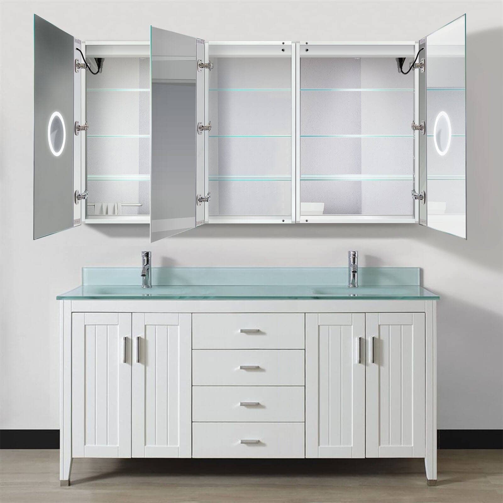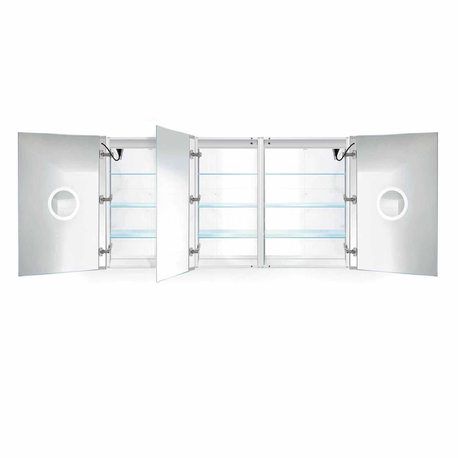 Optimize your grooming space with the Krugg Svange 66 x 36 Dual LED Medicine Cabinet, featuring a unique Left, Left, and Right door configuration. This expansive medicine cabinet offers three doors: two doors open to the left and one to the right, providing convenient access.