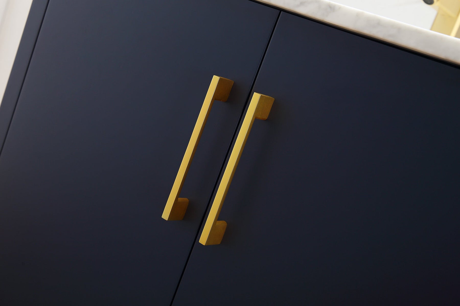 The rich blue vanity is capped with a Carrara marble countertop that is set of from the vanity and hardware to make a statement. Storage is abundant even in this smaller size with the two large doors and two lower drawers. Of course everything is on soft closing hardware as you would expect.