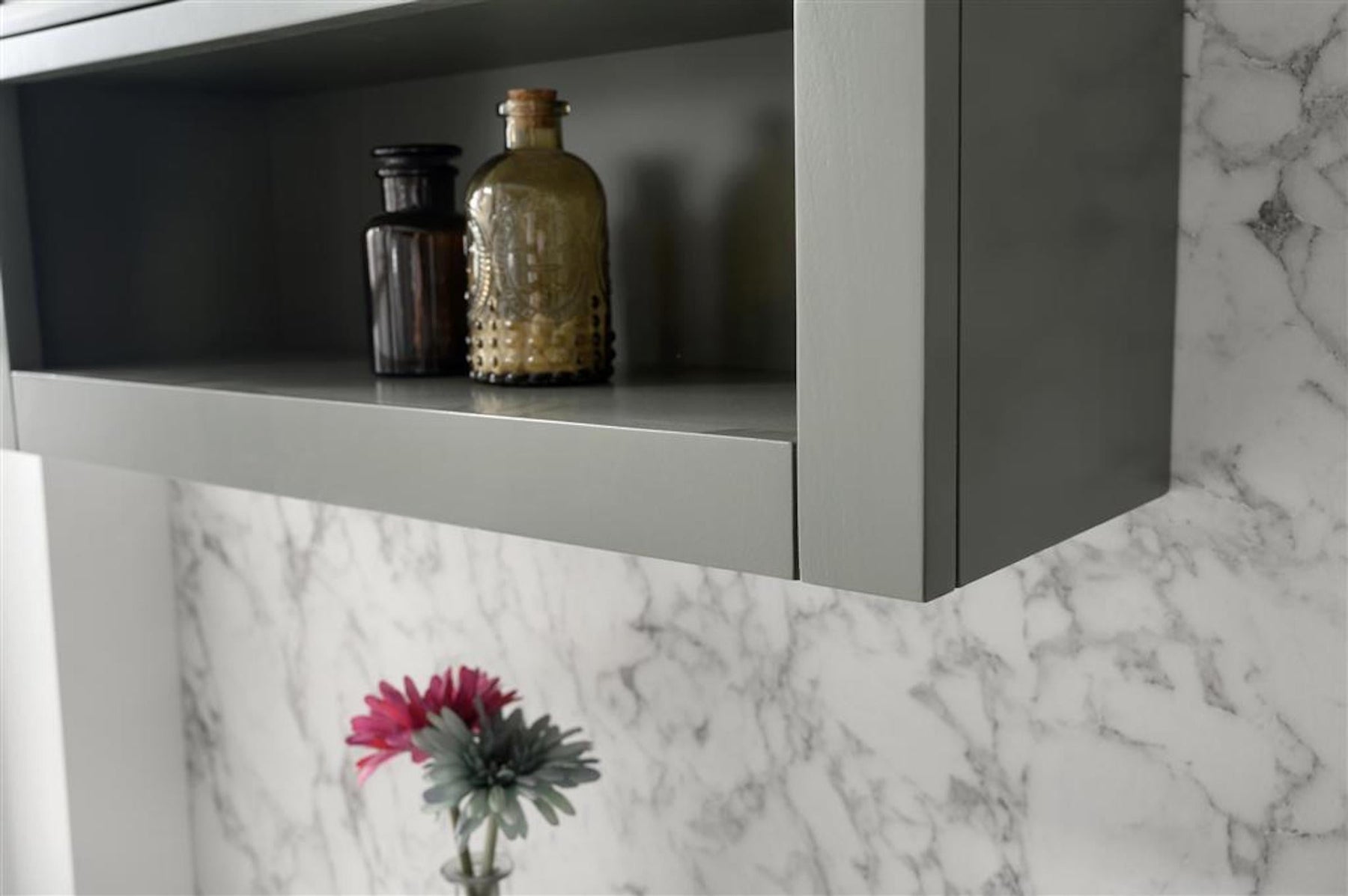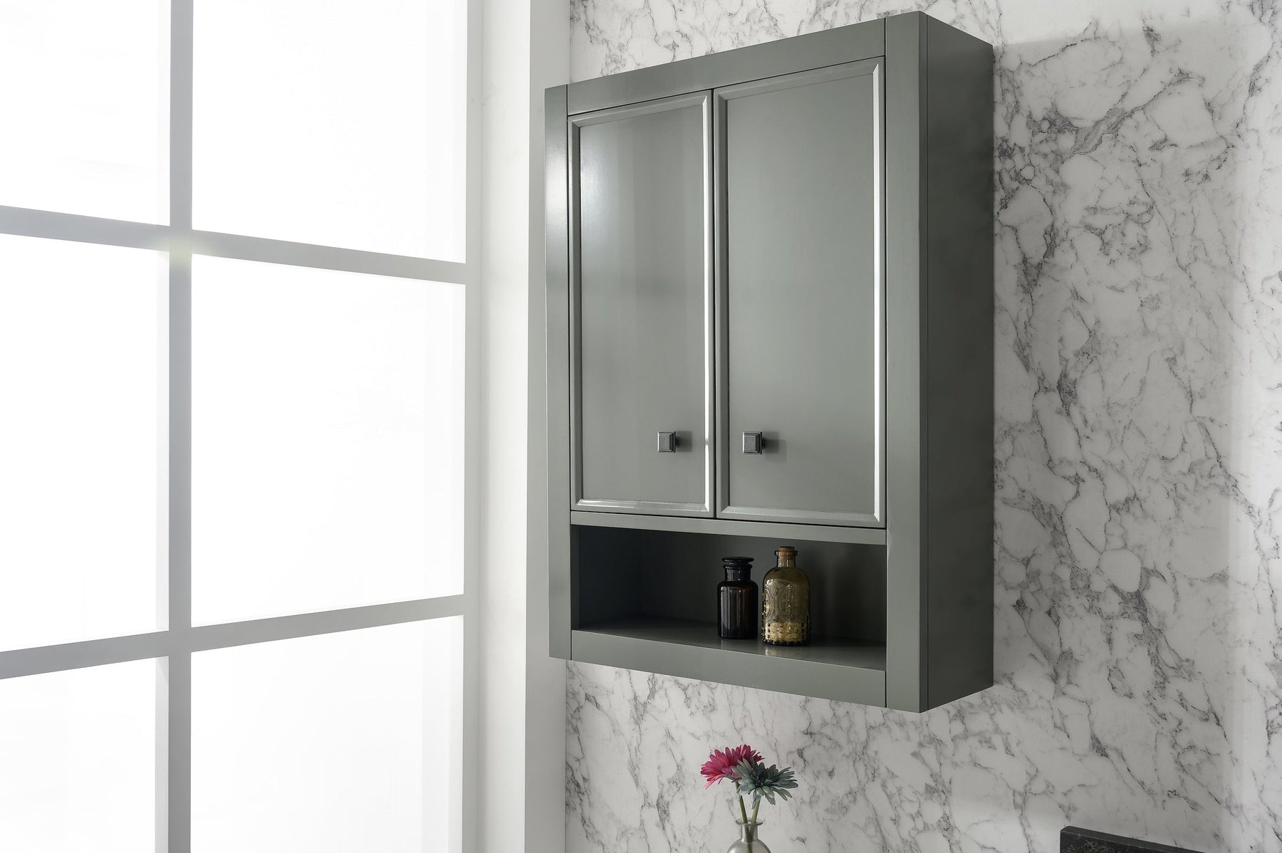 • Two doors with an inner shelf and one open shelf add additional storage to your bath.