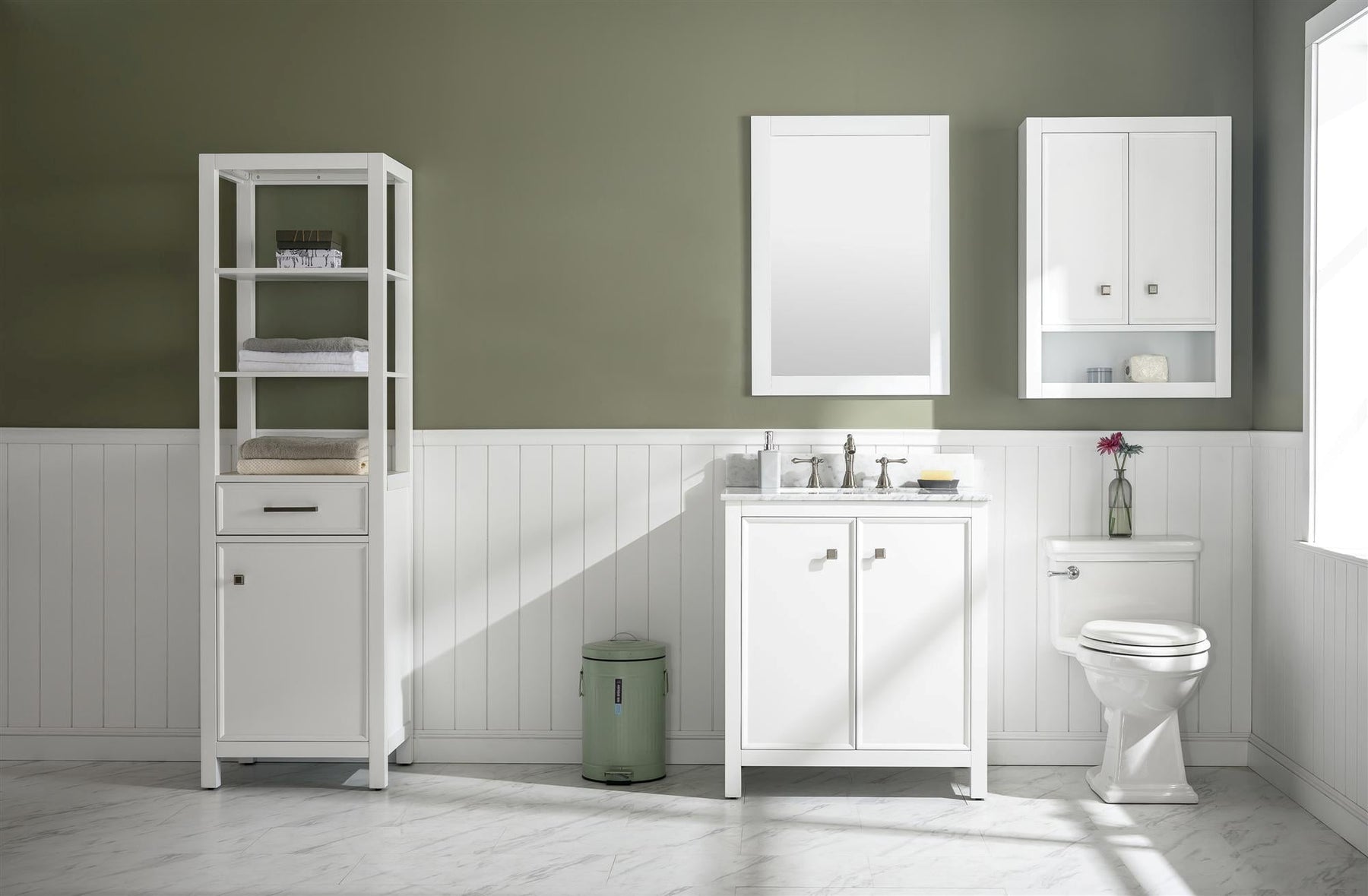 - The 18mm white Carrara marble top is the perfect complement to the color of the vanity, and adds a touch of luxury to your bath.