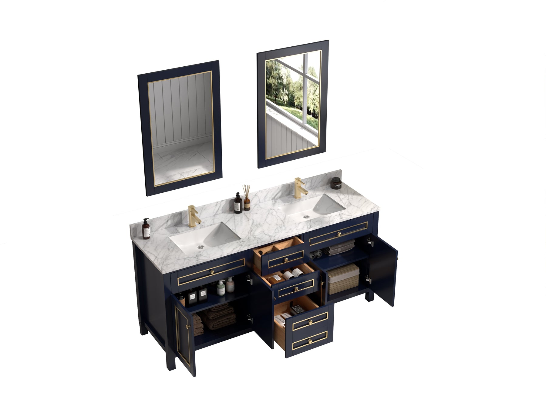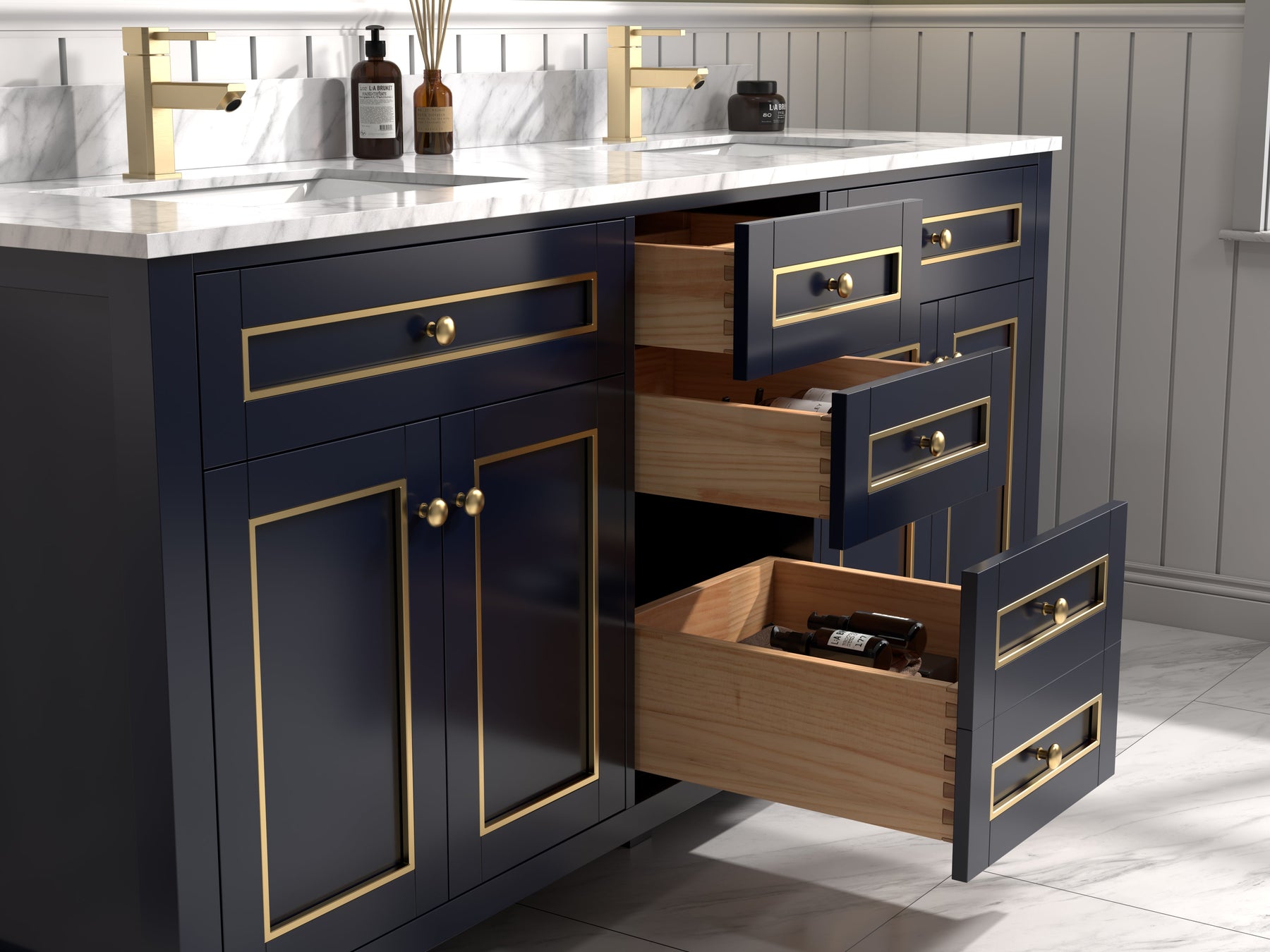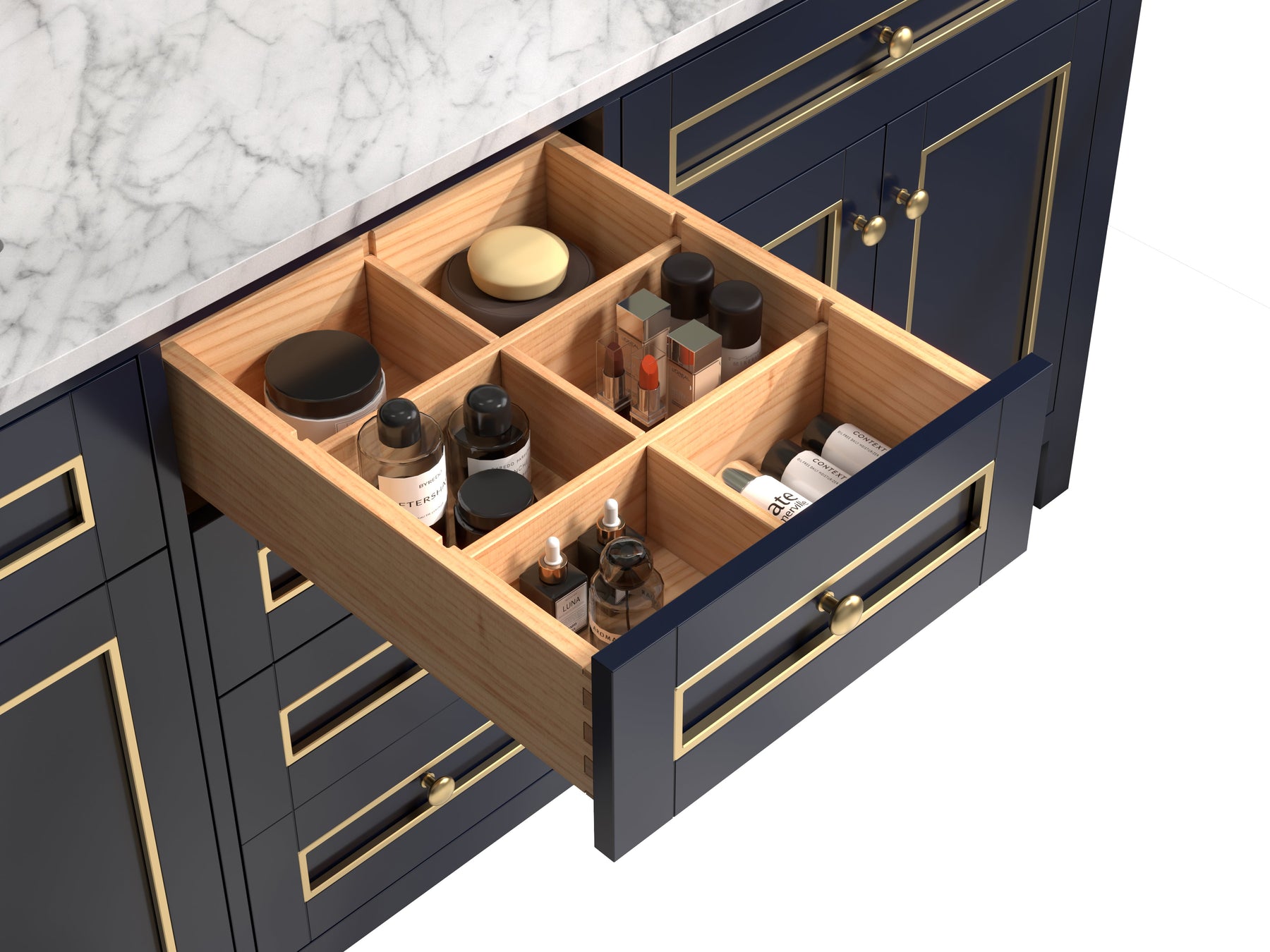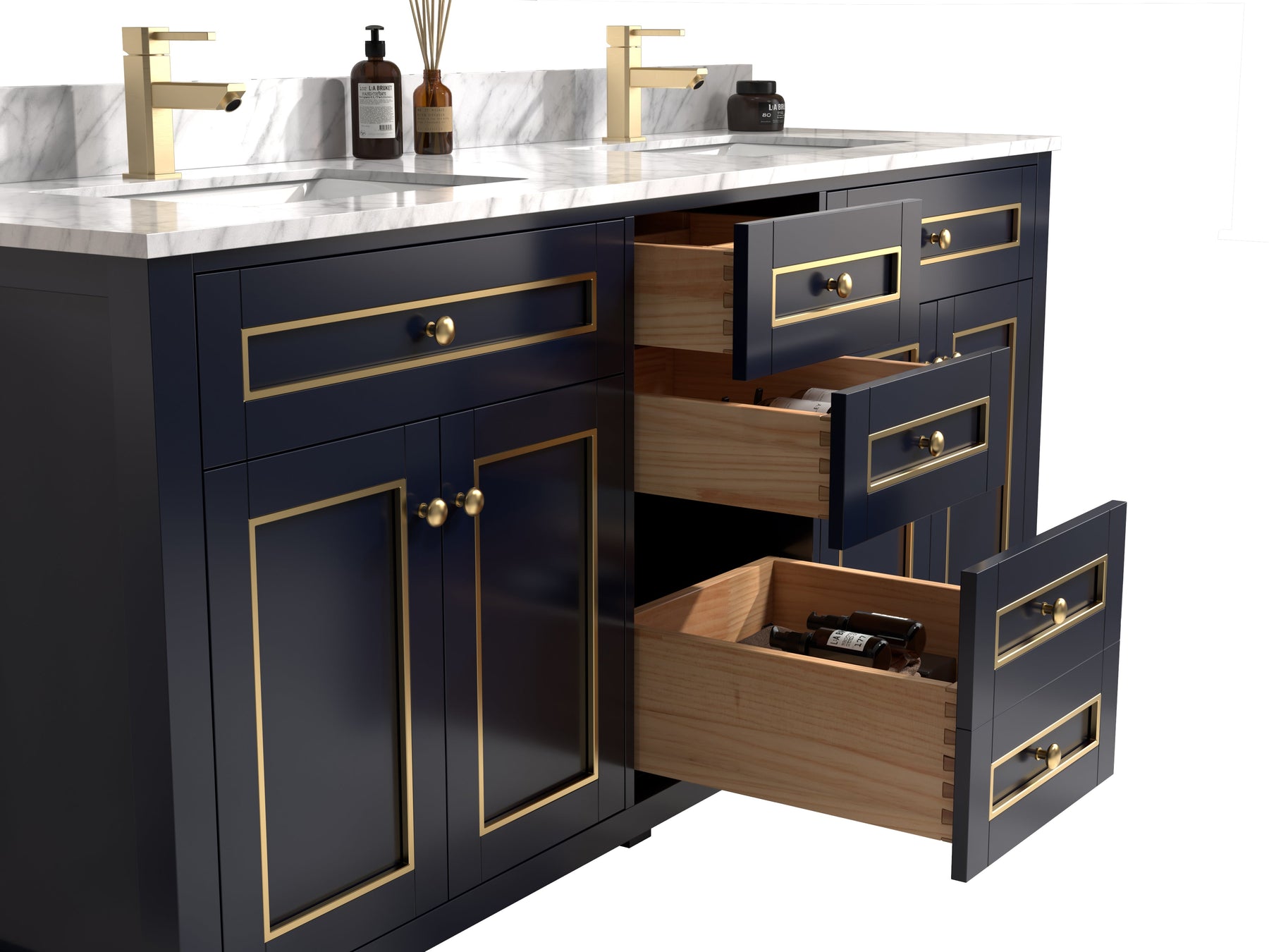 - Includes four doors that conceal an open storage area at each sink location with an additional shelf. Three drawers with dovetail joinery provide ample storage all with soft closing hardware.