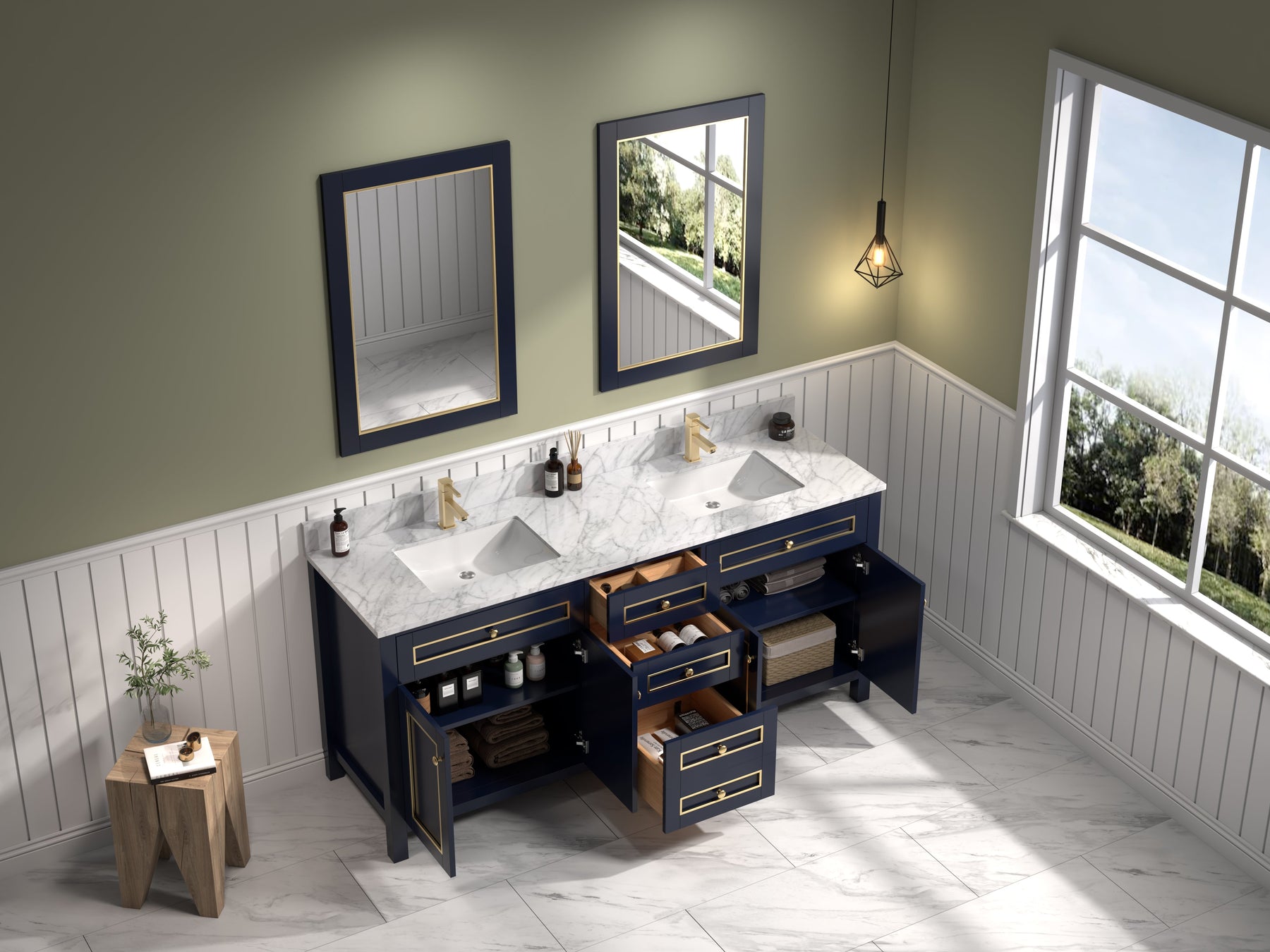 - The white Carrara marble top is the perfect complement to the color of the vanity, and adds a touch of luxury to your bath.