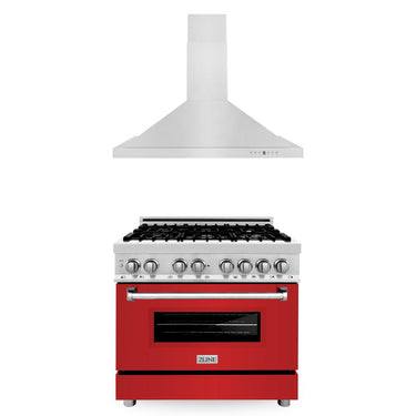 ZLINE 36 in. Kitchen Package with Satin Stainless Steel Dual Fuel Range with Red Matte Door and Convertible Vent Range Hood (2KP-RARMRH36)