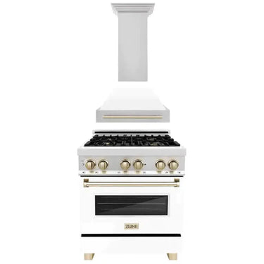 Home ZLINE Autograph Edition 30 in. Kitchen Package with Stainless Steel Dual Fuel Range with White Matte Door and Range Hood with Polished Gold Accents (2AKP-RAWMRH30-G)