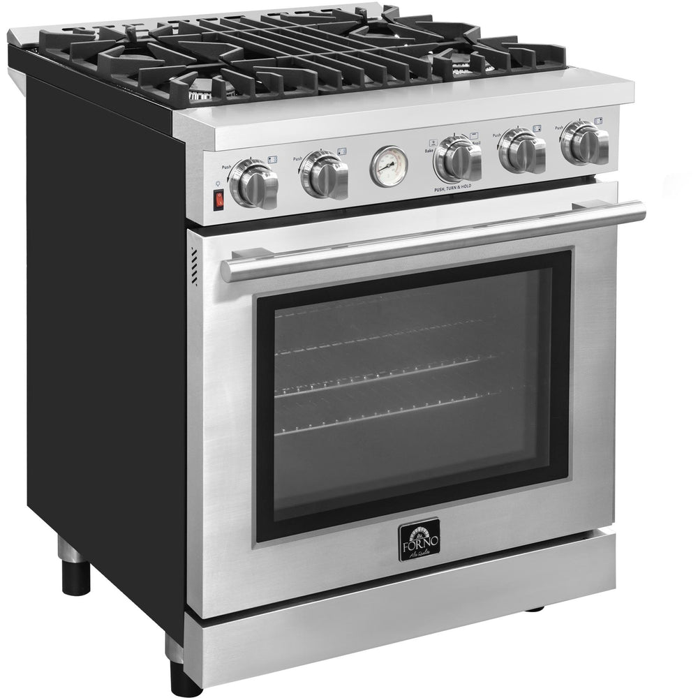 The Forno 30" Alta Qualita Freestanding Gas range brings professional styling and performance into your kitchen. A durable stainless-steel design has 4 sealed burners with a total output of 41,000 BTU including 1 powerful sealed dual-ring burner for boiling or searing and is able to perform simmering like melting chocolate or sauces, The continuous cast iron grates allow maximum stability of cookware and allow ease of sliding pan off a hot burner. The recessed enamel Cooking Surface cavity keeps spills and splashes contained and easy to clean. The 30" convection oven has a capacity of 4.62 cu. ft. with a combined broil and oven output of 25,500 BTU. Included are 2 oven racks and LP conversion kit. Additionally, zinc coated metal knobs with bezel rings will maintain their beauty for years. All FORNO products come with a 2 year warranty.