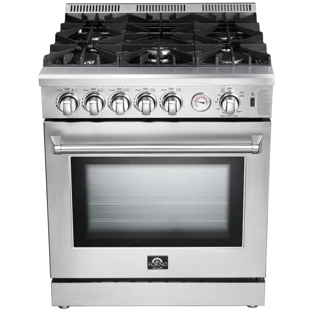 This 30-inch Forno gas range features Convection Technology, 5 cooktop burners, cast-iron grates and a total oven capacity of 4.23 cu.ft.