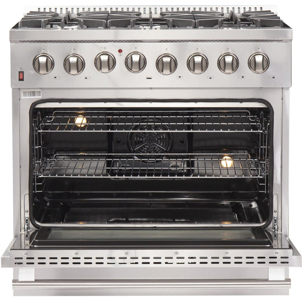 The 36" Galiano Dual Fuel Range brings professional styling and performance into your kitchen with its durable stainless-steel design. The cooking surface has 6 sealed burners with a total output of 83,000 BTU. included is 1 powerful 20K dual-ring burner for boiling or searing and is able to perform simmering like melting chocolate or sauces, The continuous cast iron grates allow maximum stability of cookware and allow the ease of sliding pan off a hot burner. The 5.26 cu. ft. gas oven has a total broil and bake output of 44,000 BTU and the option of using true convection bake, broil or roasting. Included are 2 oven racks and LP conversion kit. Additionally, zinc coated metal knobs with bezel rings will maintain their beauty for years. All FORNO products come with a 2 year warranty.