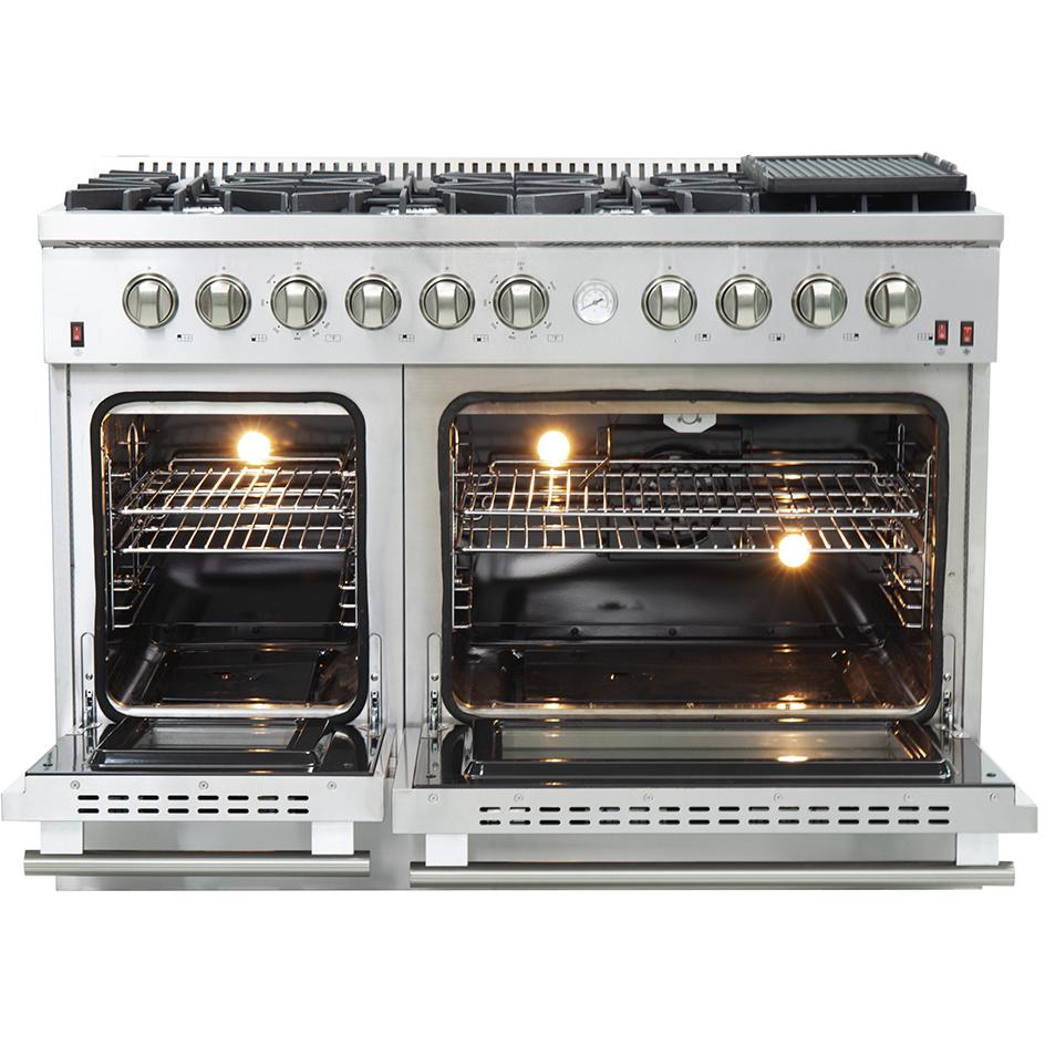 The 48" Forno All Gas Range with Air Fry brings professional styling and quality into your home kitchen with its durable stainless-steel design. Cooktop has 8 sealed burners with a total stove top output of 107,000 BTU including 1 sealed dual-ring burner for simmering delicate melting chocolate or cooking sauces, giving you the ability to cook up whatever delicious meals you desire. The continuous cast iron grates allowmaximum stability of cookware mobility over a recessed enamel cooktop cavity which keeps spills and splashes contained and easy to clean. The cumulative capacity 6.58 cu. ft. double gas ovens with a total output of 44,000 BTU are encased in a black enamel interiors with one oven fitted with an internal convection fan, thermostat and regulator ensures to achieve fast, precision and consistent oven cooking along for easy viewing are 3-layer glass oven door windows. Included are 4 chrome plated oven racks, air fryer rack, drip pan, reversible griddle, concave wok ring and LP conversion kit. Housed in a high-grade stainless steel body and zinc knobs, this unit sports a stylish look that is built to last. All Forno products are backed by an iron clad 2-year warranty for your satisfaction. Skip the high price tags without sacrificing quality and performance. Lower the cost of living with Forno.