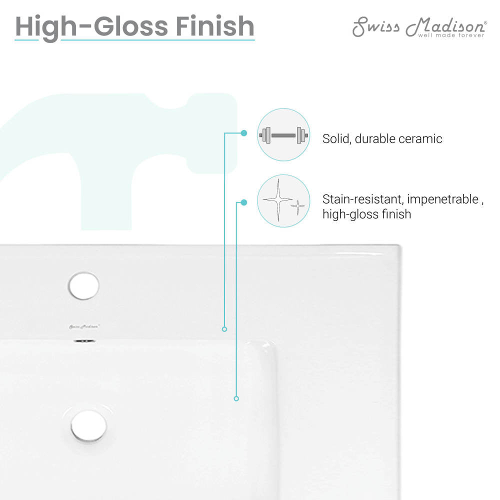 Discover intricate precision and design excellence in the Swiss Madison collection, redefining contemporary bathroom aesthetics. Discover the epitome of seamless design and effortless maintenance with our vanity tops. A perfect blend of aesthetics and functionality. Offered in white with a glossy finish.