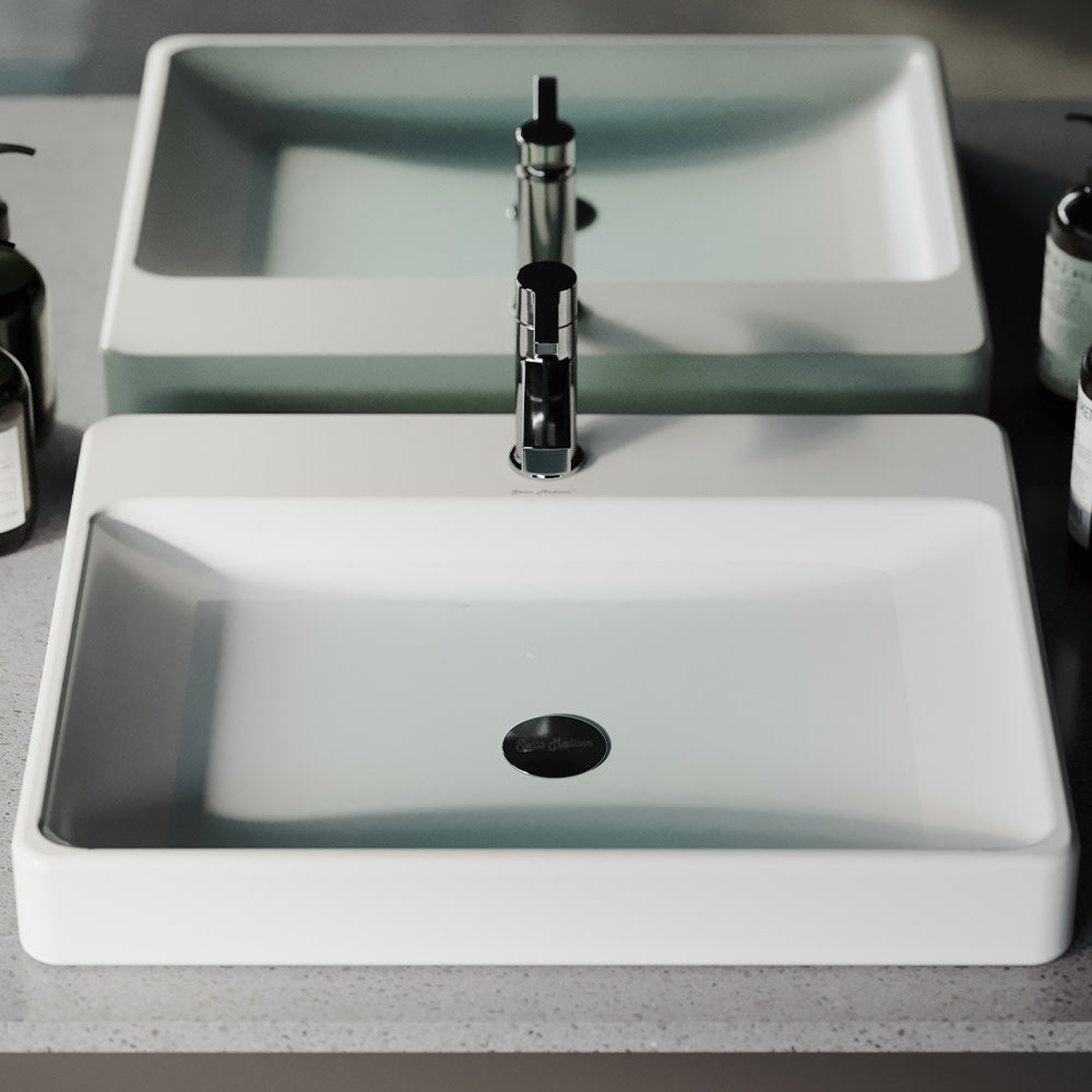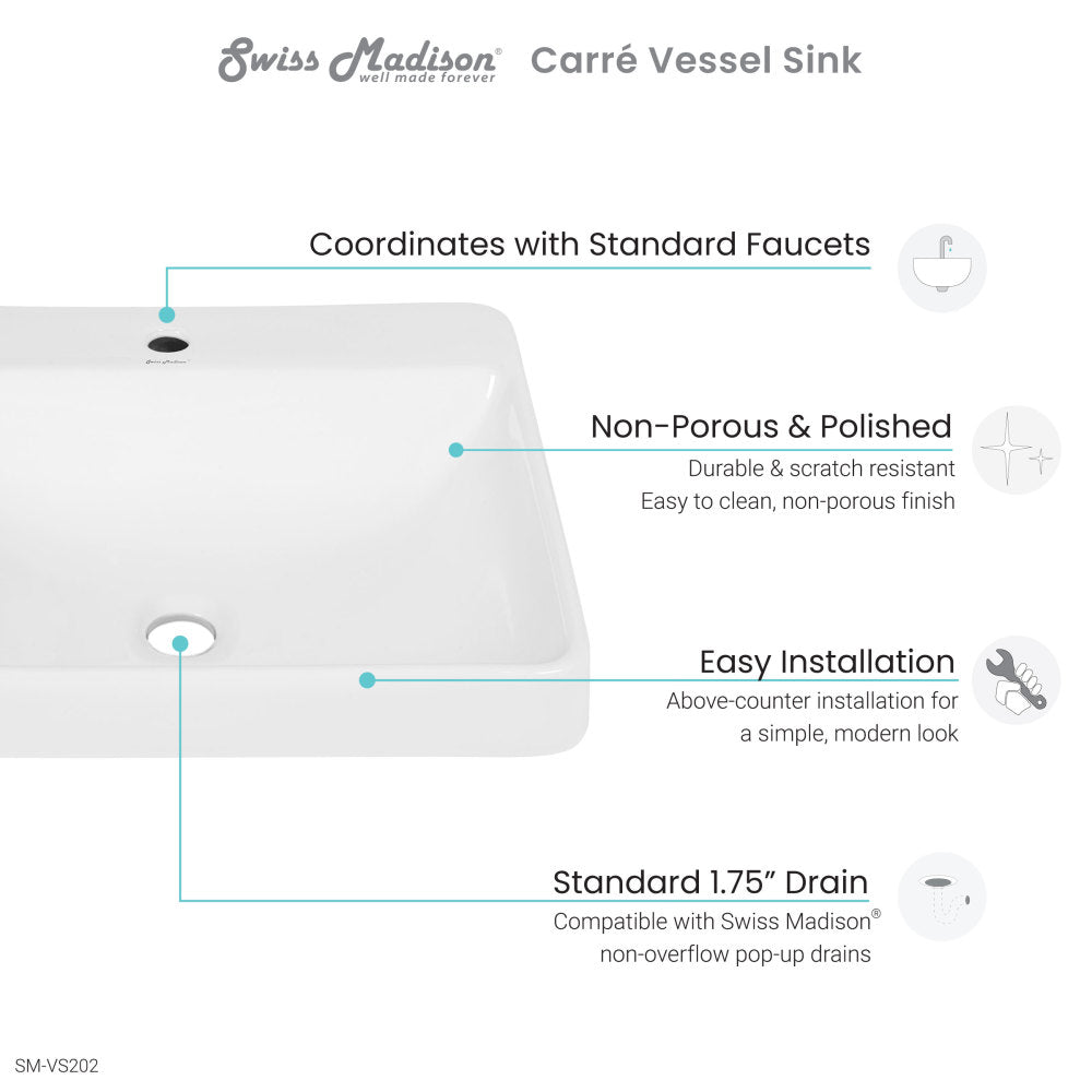 Embrace geometric balance with the Carre collection, where clean lines and modern design principles take center stage. Elevate your bathroom aesthetic with our vessel sinks, blending artistry and utility to create a stunning statement piece. Offered in white with a glossy finish.