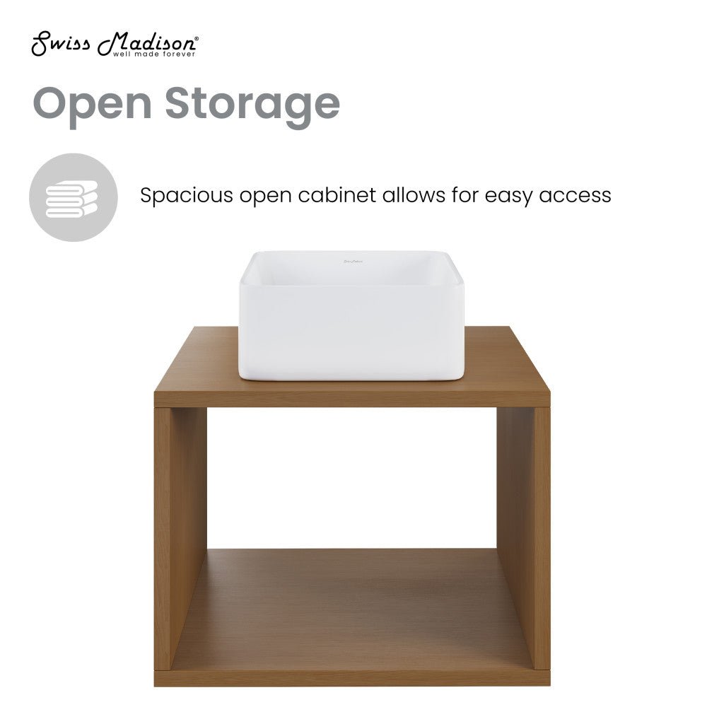 • The open shelving design allows easy access to towels, toiletries, and other essentials.