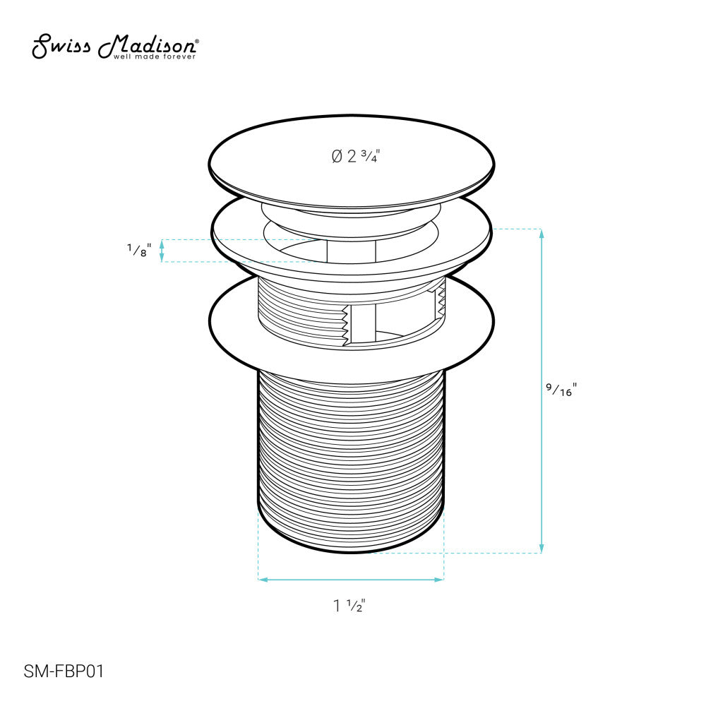 A modern and sleek drain for Swiss Madison freestanding bathtubs. Our pop-up drain combines a timeliness look with easy-to-install operation for a truly enjoyable upgrade to your bathtub. Simply pressing the drain allows it to open and close, while preventing unwanted clogs or lost items.