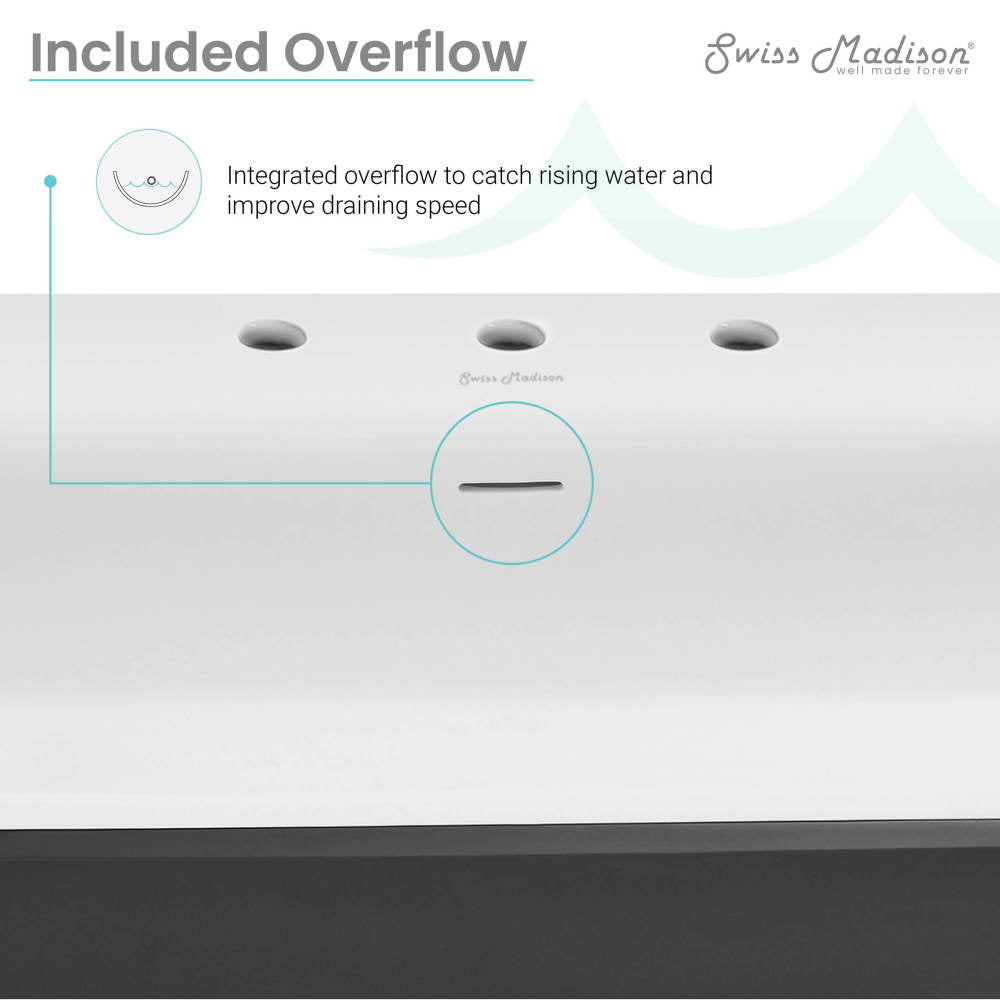 - Overflow: Equipped with an overflow that offers easy installation, spill prevention, and space-saving properties.