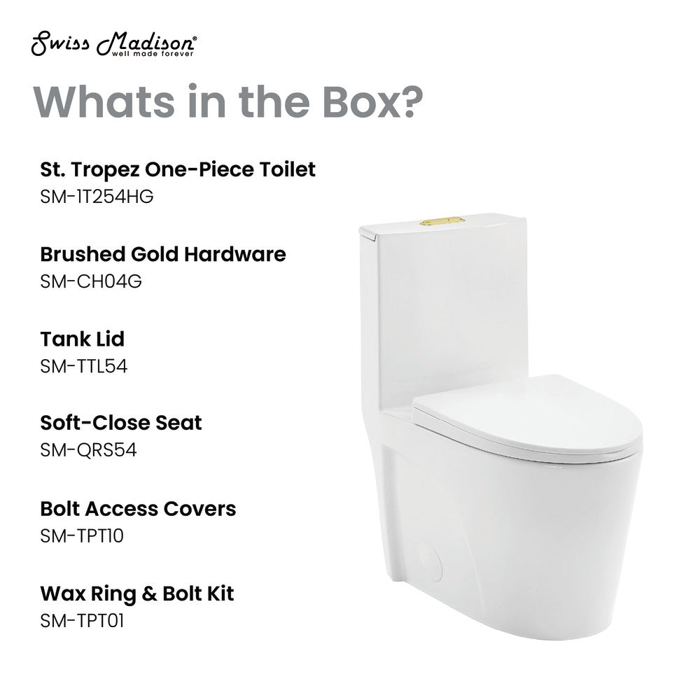 St. Tropez One Piece Elongated Toilet Dual Vortex Flush, Gold Hardware
