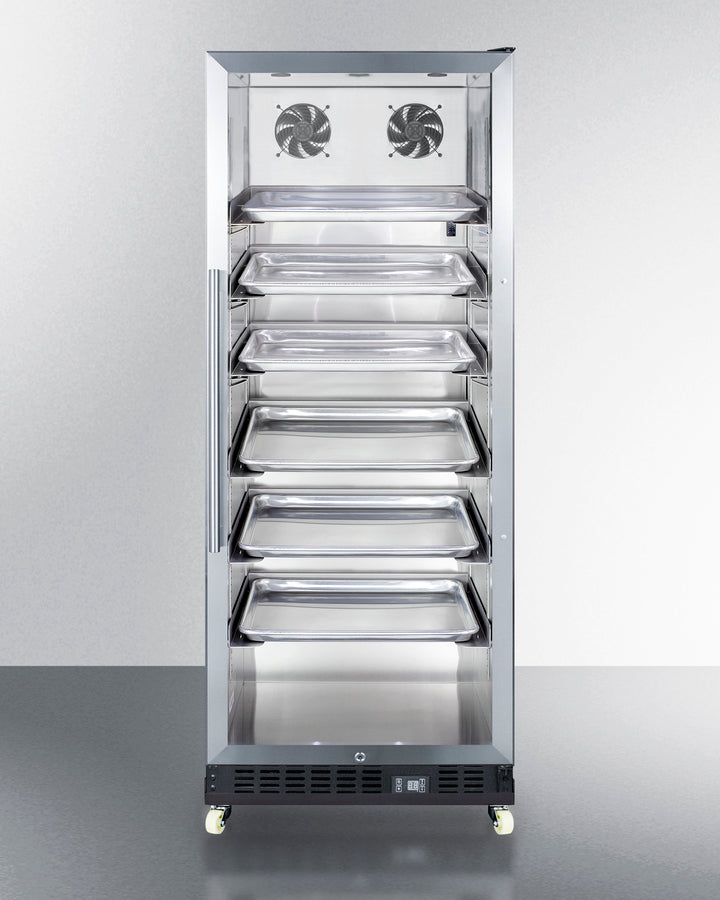 This unit comes with six aluminum half-sheet pans, ideal for storing beverages and other sealed items. Six chrome shelves are also included for user convenience. LED lighting offers full illumination of stored products and a digital thermostat ensures easy and intuitive temperature management. The readout can be viewed in Celsius or Fahrenheit.